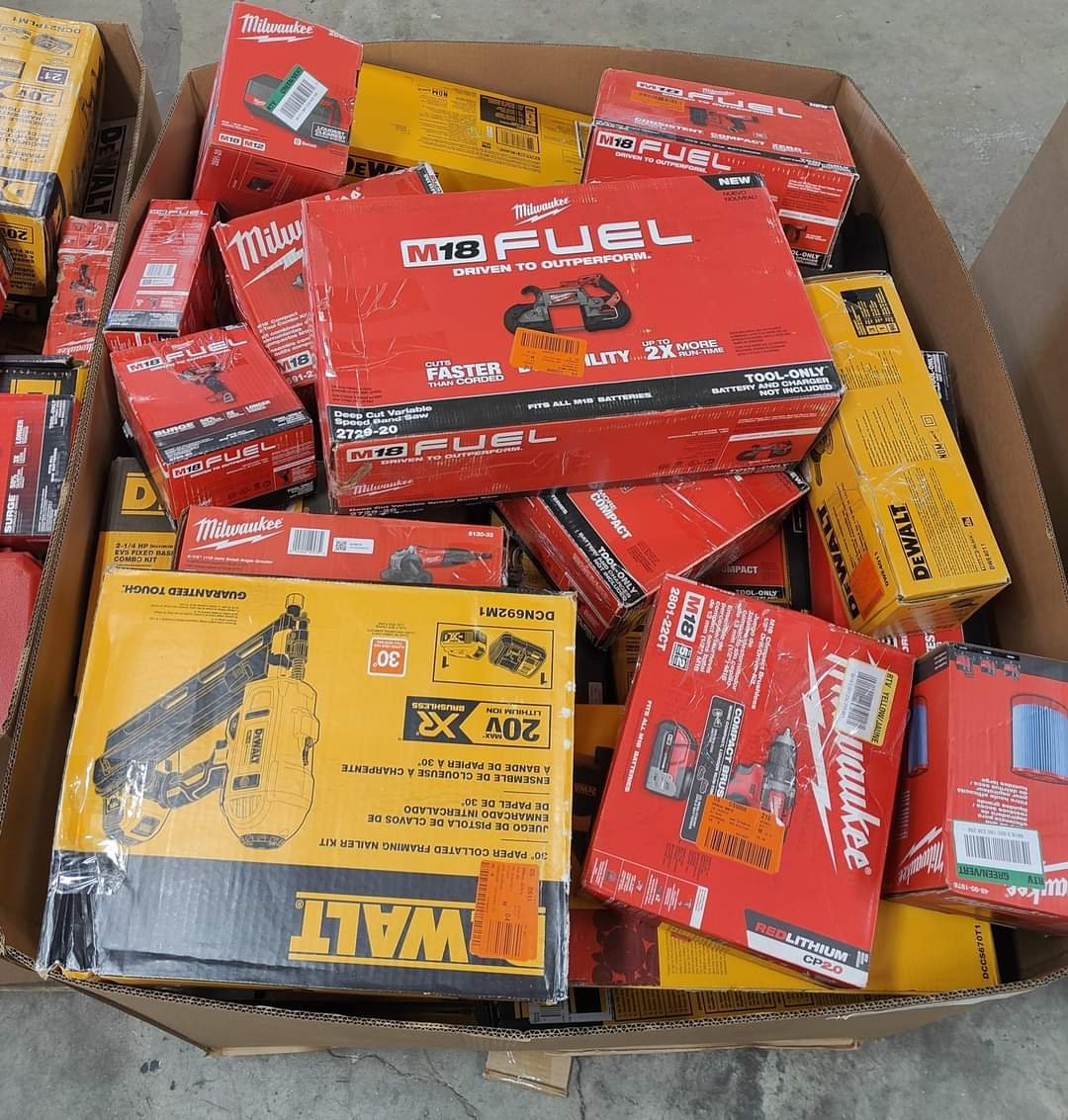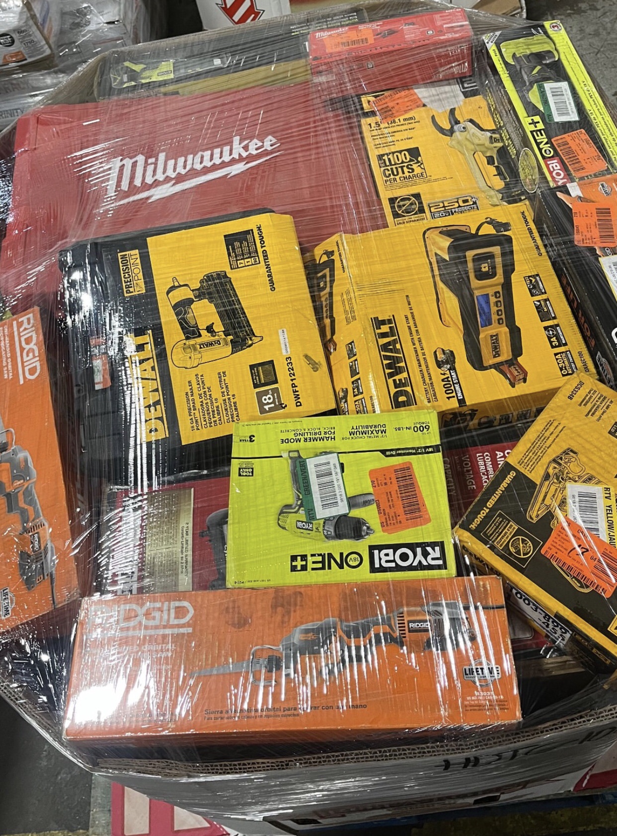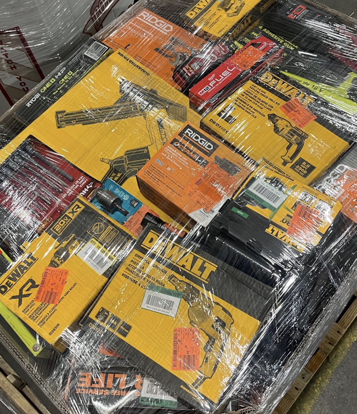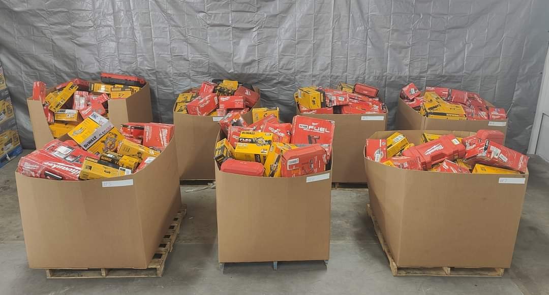 Tools pallets for sale. These are DeWalt, Milwaukee, Ryobi and Ridgid. hand tools mixed with DeWalt outdoor. Right around 38 pieces in each pallet. These are brand new and some damage boxes all in very good condition.